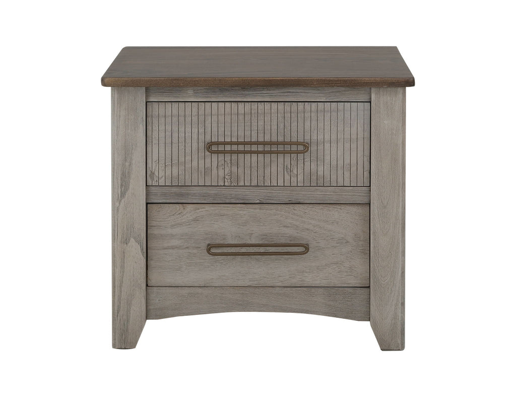 2 Drawer, Nightstand. The Ridge nightstand features two spacious drawers, offering plenty of storage for all your bedroom essentials. It... 2 Drawer, Nightstand. The Ridge nightstand features two spacious drawers, offering plenty of storage for all your bedroom essentials. It features sleek metal handles that enhance its modern aesthetic. Made from Melina and poplar wood, this collection guarantees durability and timeless appeal. The elegant light gray finish and brown tops blend seamlessly with any décor style. Additionally, the channeled design adds a touch of sophistication and texture to the furniture.Product Features Crafted from Melina and poplar wood. Multi-step lacquer finish in a light gray and brown finish on tops. Mortise and tenon construction ensure stability and durability on all pieces Microfiber-lined top drawer. English dovetail on 100% solid wood drawer fronts. Hafele steel slides. Custom metal pulls with non-chip finish. Mirror sold separately. Ridge - Nightstand - Sand Brown28.0"W x 16.25"D x 26.25"H - 52.0 lb View more