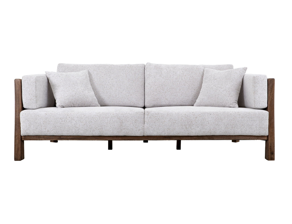 Wooden Frame, Upholstered Sofa. Transform your living space with this stunning wooden-framed sofa, which perfectly combines craftsmanship and comfort. The Roots Collection features back cushions upholstered in a white fabric, providing plush support and an elegant touch. What truly sets this collection apart is its beautifully designed, gently flat armrests, enhancing its aesthetic appeal and ergonomic comfort. The wooden back frames and legs, with their intricate detailing, showcase timeless sophistication. Redefine your space with furniture that makes a statement because every home deserves a touch of artistry.