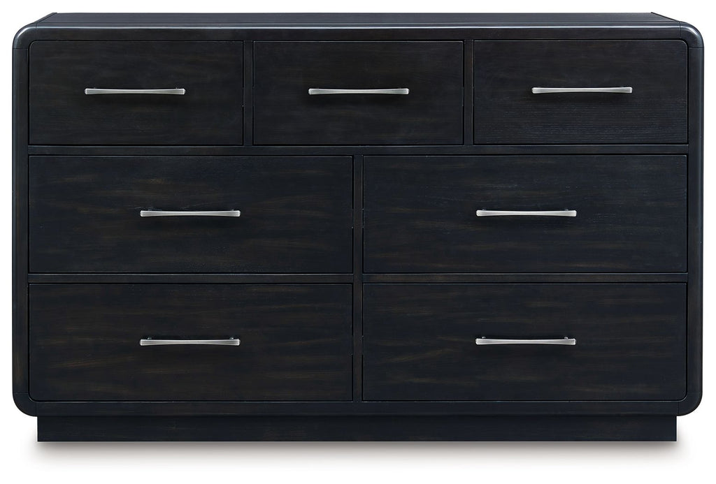 Inspired by art deco design, this softly shaped dresser makes a lasting impression in a simply stunning way. Its magnificent... Inspired by art deco design, this softly shaped dresser makes a lasting impression in a simply stunning way. Its magnificent curved silhouette is enhanced by a rich layered black finish on the textured wood grain surface. This is the statement piece you’ve been dreaming of to elevate your contemporary inner sanctum.Additional Dimensions Top drawer interior (lined) (3): 0" Middle and bottom drawer interior (4): 0" Product Features Made with hardwood solids and ash veneer Black finish on textured wood grain surface Burnished nickel-tone pulls Waterfall edges 7 smooth-gliding drawers with fully finished interior, dovetail construction and heavy duty ball-bearing side glides Rowanbeck - Dresser - Black63.75"W x 18.0"D x 38.38"H - 266.0 lb View more