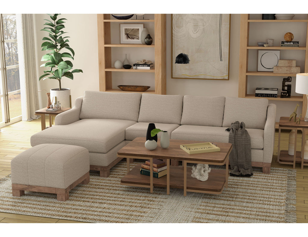 Wooden Frame & Base, Sectional. With its chunky, wide silhouette, the Samba collection infuses your living room with a touch of traditional charm. Supported by a sturdy frame crafted from solid pine wood, it rests gracefully on low-profile block feet with a rich brown hue.