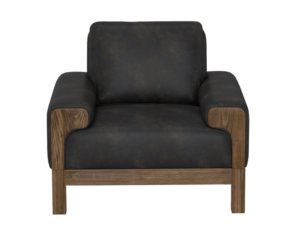 Wooden Frame & Base, Armchair. Infuse your home with modern, one-of-a-kind design and elevate your living room. Featuring exposed wood... Wooden Frame & Base, Armchair. Infuse your home with modern, one-of-a-kind design and elevate your living room. Featuring exposed wood and premium-quality fabric, this collection seamlessly brings the beauty of nature right into your living space.Product Features Black. 77% Polyester. 23% PU. Constructed with plywood 15 mm thickness 5-layer ply, providing strength and durability to the frames—No-sag sinuous springs with tie wire for uniform seating. Dual-density foam on seats. 1.8 Density core wrapped with resilient and 1.4 density foam for an ultimate Comfort Seat. Dacron-wrapped Cushion cores Ultra-crowning on seats. Elastic webbing with loose pillow backs using siliconized virgin Dacron fiber utilizing sewn-in panels. (No migration). Fully padded with microfilaments foam for a better finish look. Exposed solid pine wood incorporating finishes to match case-good collections. Includes a decorative throw pillow. Sedona - Armchair - Licorice43.25"W x 39.5"D x 38.0"H - 96.0 lb View more