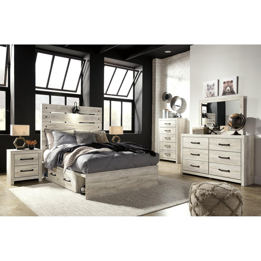 What a delightful take on rustic industrial style. Whether modern loft or modern farmhouse, this bedroom set makes itself at... What a delightful take on rustic industrial style. Whether modern loft or modern farmhouse, this bedroom set makes itself at home. The wispy whitewash palette enhances without covering the grain for that weathered look you crave. Elongated drawer pulls on the case pieces elevate the aesthetic. View more