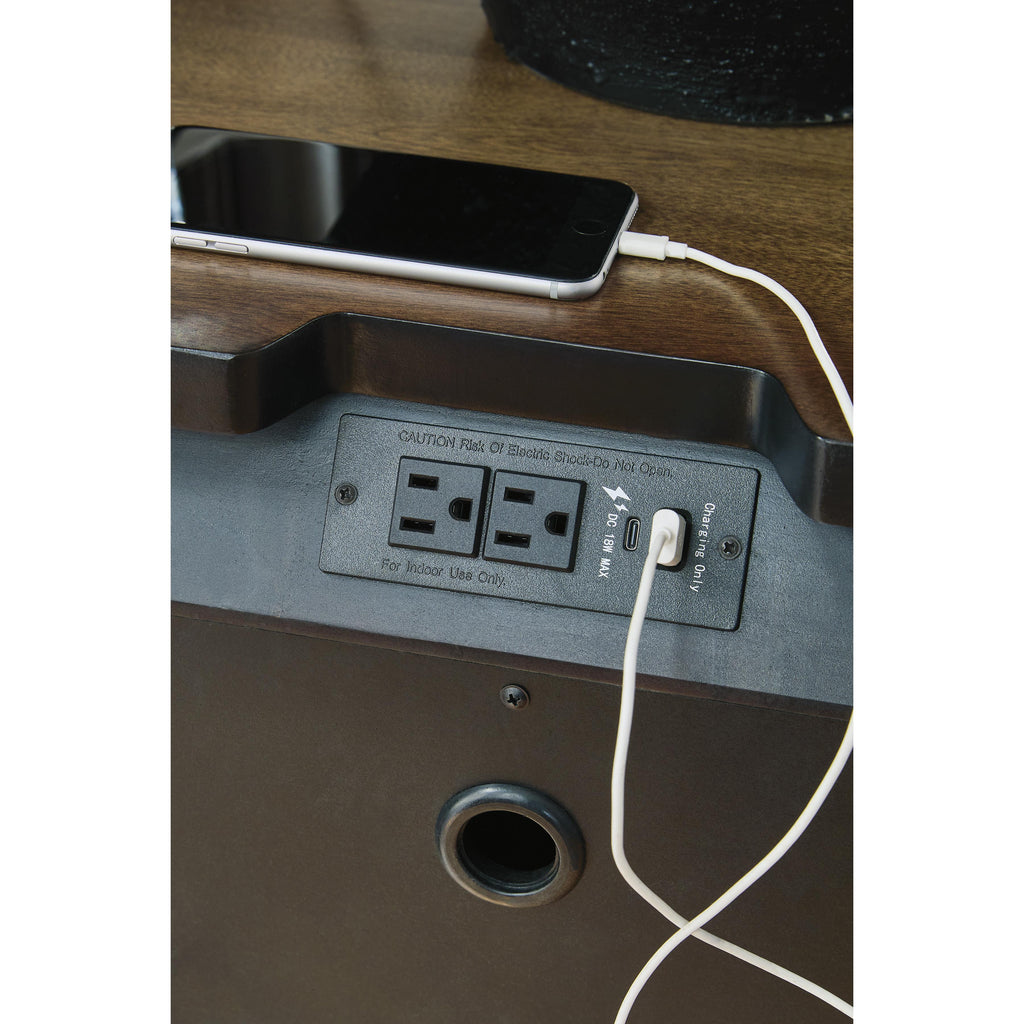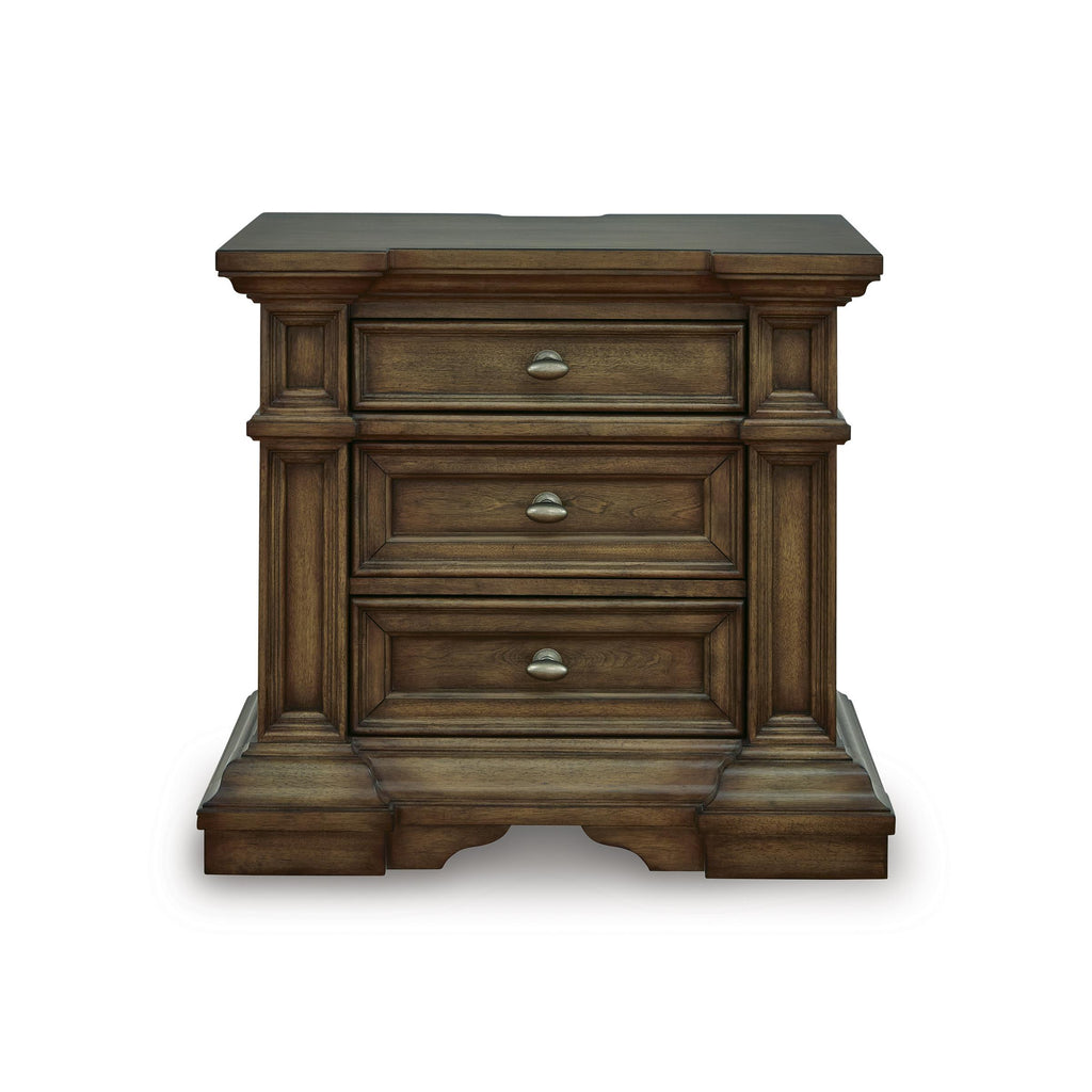 Time-honored style, made for today's home. This nightstand pays homage to traditional aesthetics, with a richly detailed finish incorporating a... Time-honored style, made for today's home. This nightstand pays homage to traditional aesthetics, with a richly detailed finish incorporating a sense of stately elegance. Included power outlets and USB charging add subtle function. Substantially-scaled moulding details and antiqued brass-tone hardware round out the piece in graceful fashion. View more