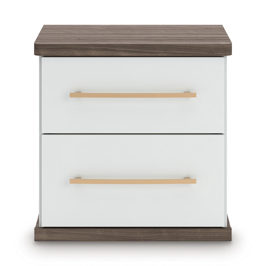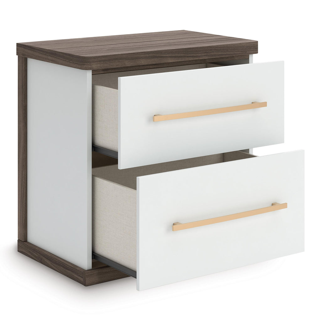 Looking to make a subtly striking statement in your bedroom? We've got you covered. This nightstand’s sophisticated two-tone treatment marries... Looking to make a subtly striking statement in your bedroom? We've got you covered. This nightstand’s sophisticated two-tone treatment marries a warm brown finish over replicated walnut grain with a matte white finish. Rounded corners and a thick top radiate an air of modern panache, while sleek handles in a champagne finish add a sparkling touch to the spacious drawers. And built-in USB charging keeps your gadgets powered up. It’s a master class in contemporary yet comfortable character. View more