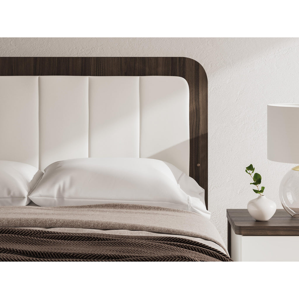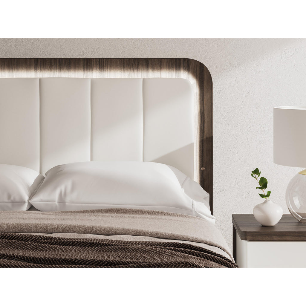 Looking to make a subtly striking statement in your bedroom? We've got you covered. This queen upholstered bed’s sophisticated two-tone... Looking to make a subtly striking statement in your bedroom? We've got you covered. This queen upholstered bed’s sophisticated two-tone treatment marries a warm brown finish over replicated walnut grain with a matte white finish. Highlighted with a wonderful white faux leather, the headboard features warm ambient lighting for that cozy feeling we all love at bedtime. Rounded corners radiate an air of modern panache. It’s a master class in contemporary yet comfortable character. View more