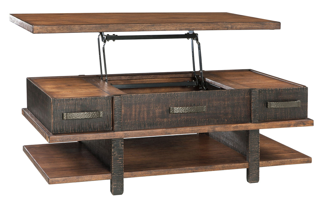 Earthy, rustic character. Clean, contemporary lines. The best of both stack up beautifully in this lift top coffee table. A simple, blocky profile is enriched with a two-tone finish with deep distressing for a decidedly different aesthetic.