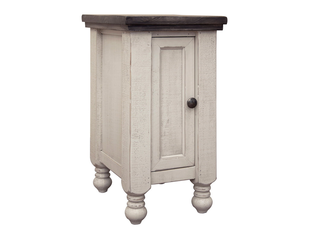 1 Door Chairside Table. Exuding farmhouse chic with just the right touch of old-world charm, the Stone Collection is meticulously... 1 Door Chairside Table. Exuding farmhouse chic with just the right touch of old-world charm, the Stone Collection is meticulously crafted from solid pine wood. The wood is lightly distressed, showcasing a white finish and complemented by weathered gray tops.Product Features Crafted of solid pine wood and engineered wood on the tops to prevent seasonal cracks. Two-tone, multi-step lacquer finish. The top features a weathered gray finish on hand-distressed wood, while the rest of the case has an eggshell antiqued finish. Mortise and tenon construction offers stability and durability. One door with magnetic catches. Metal pulls with non-chip finish. Stone - Chairside Table With 1 Door - Antiqued Ivory / Weathered Gray14.0"W x 17.25"D x 25.5"H - 26.0 lb View more