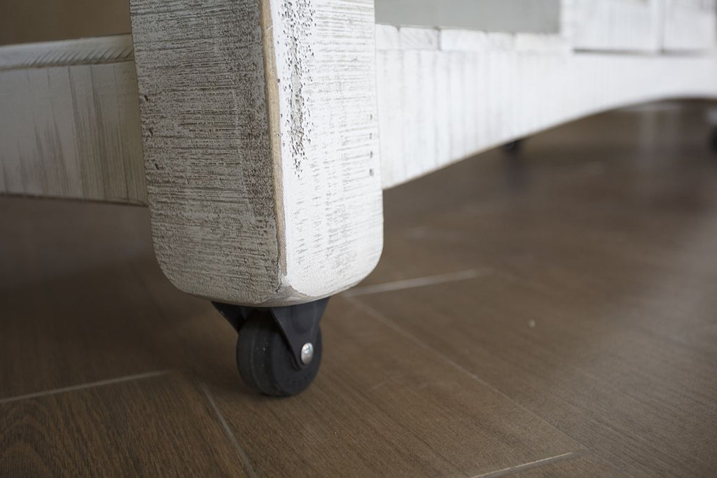 - Two-tone finish features a hand-rubbed off-white finish and warm gray stain on top