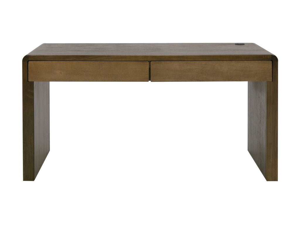 2 Drawer, Desk. Introducing the Tamesis Desk, a blend of modern design and practicality for your workspace. This minimalist desk... 2 Drawer, Desk. Introducing the Tamesis Desk, a blend of modern design and practicality for your workspace. This minimalist desk features clean, sleek lines and is expertly crafted from sustainably sourced mango and melina wood. Its elegant multi-step lacquer finish showcases a beautiful interplay of light brown and chocolate brown tones, enhancing the wood's natural grain. The Tamesis Desk has a spacious rectangular top with rounded edges, combining modern style with comfort. It features a circular grommet with a power outlet and USB C port for added convenience. It includes two well-sized drawers for ample storage, helping you maintain an organized workspace. With solid wooden legs and sturdy construction, this desk is a durable addition to your office. The Tamesis Desk combines elegant aesthetics with practical features, making it ideal for working from home or setting up a stylish office. Its sophisticated design and functionality enhance productivity and workspace ambiance.Product Features Crafted from sustainably sourced mango wood and melina wood. Multi-step lacquer in light brown & chocolate brown finish Mortise and tenon construction ensure stability and durability on all pieces. Power grommet with outlet and USB-C port. English dovetail on 100% solid wood drawer fronts. Hafele steel slides. Tamesis - Desk - Barrel Brown60.0"W x 23.25"D x 31.5"H - 127.0 lb View more
