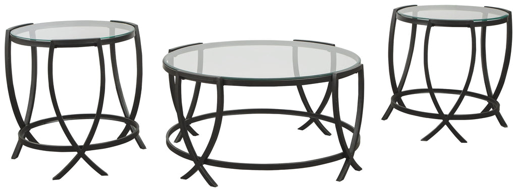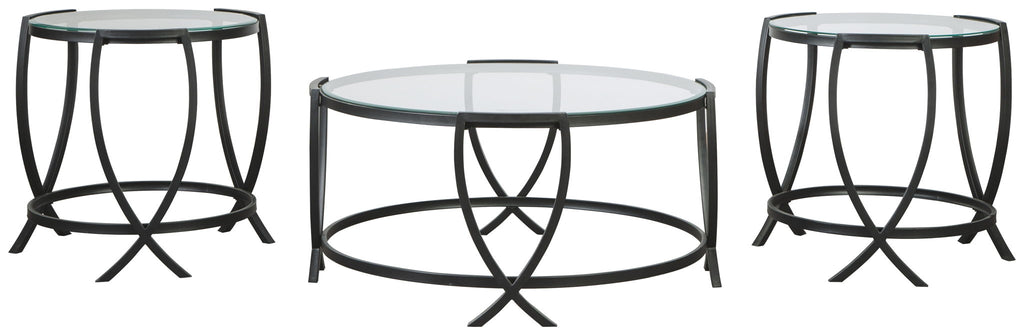 What a clear winner for lovers of contemporary style. Making a brilliant impression with its metal arc X-motif, this coffee... What a clear winner for lovers of contemporary style. Making a brilliant impression with its metal arc X-motif, this coffee table set is sure to round out your space with fashionable flair.Additional Dimensions Cocktail table: 0" End table (2): 0" Product Features Includes coffee table and 2 end tables Metal base in black finish Clear tempered glass tabletop with beveled edge Assembly required Tarrin - Occasional Table Set (Set of 3) - Black36.13"W x 36.13"D x 17.88"H - 80.0 lb View more