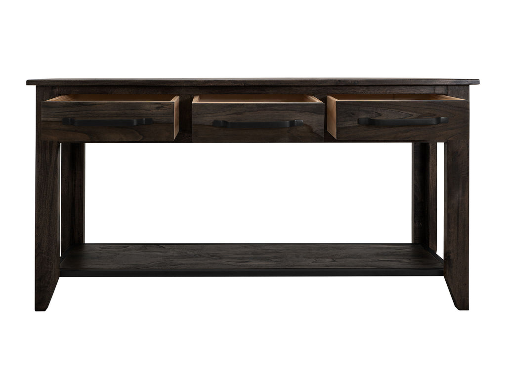 3 Drawer, 1 Shelf Sofa Table. Enhance your living room with our exquisite Dark Teak Occasional Tables. Crafted from sustainable Mango, Melina wood, and engineered Teak, this collection showcases the natural beauty of the wood grain. Designed to elevate your home, it creates a relaxing and inviting atmosphere. Explore our collection today and discover how to elevate your home with timeless elegance!