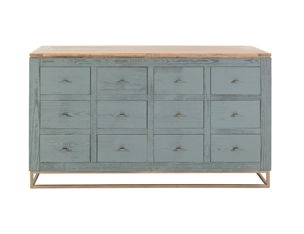 12 Drawer, Console. The Timber Console is a remarkable furniture piece that beautifully combines functionality with style. Designed to enhance any room, it features 12 spacious drawers, providing generous storage space for all your essentials while keeping your living area organized and clutter-free. Crafted from high-quality pine and poplar wood, the console showcases a rich, multi-step lacquer in an eye-catching green finish, accented by a hand-rubbed brown top that enhances the wood's natural beauty. The console is supported by a sleek, modern metal base in a sophisticated gold finish, adding a touch of luxury and elegance to its overall design. Whether used in a living room, hallway, or entryway, The Timber Console is not just a storage solution; it's a striking statement piece that elevates your home decor.