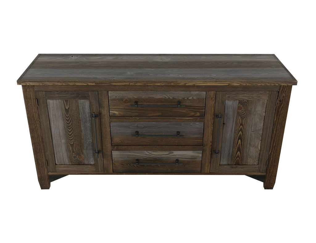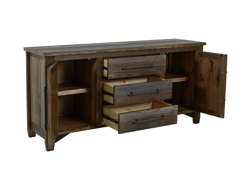3 Drawer, 2 Door, Buffet. Enhance your dining experience with the Town Dining Collection, which beautifully combines timeless elegance and... 3 Drawer, 2 Door, Buffet. Enhance your dining experience with the Town Dining Collection, which beautifully combines timeless elegance and everyday functionality, exemplified by our thoughtfully designed Town Buffet. This piece showcases a blend of rustic charm and modern sophistication. It features industrial-style iron center handle pulls that create a striking contrast between rugged appeal and refined elegance. The buffet offers practical storage solutions, including shelves hidden behind doors and spacious drawers, making it a statement piece that radiates warmth and character.Product Features Crafted of pine and poplar wood. Multi-step lacquer in brown and gray highlights. Mortise and tenon construction offers stability and durability. English dovetail on 100% solid wood drawer fronts. Hafele steel slides. Custom metal handles with non-chip finish. Town - Buffet - Multicolor68.5"W x 19.75"D x 34.25"H - 143.0 lb View more