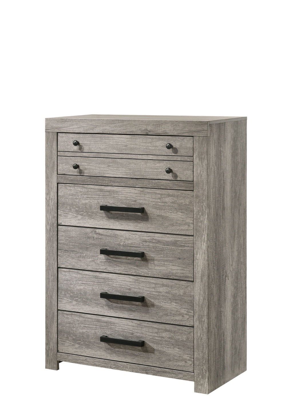 This bedroom set presents a harmonious blend of rustic charm and streamlined design, showcasing a weathered gray finish that brings... This bedroom set presents a harmonious blend of rustic charm and streamlined design, showcasing a weathered gray finish that brings a tranquil, grounding atmosphere to any sleeping space. The ensemble includes a robust bed frame with a striking headboard that makes a solid statement, alongside matching pieces that balance functionality with aesthetic appeal. Each item, from the sturdy dresser to the sleek nightstands, features clean lines and discreet metal handles that add a modern touch to the rustic texture.Product Features Metal center runner Dovetail drawer construction Tundra - Chest - Gray34.72"W x 16.26"D x 49.41"H - 105.6 lb View more