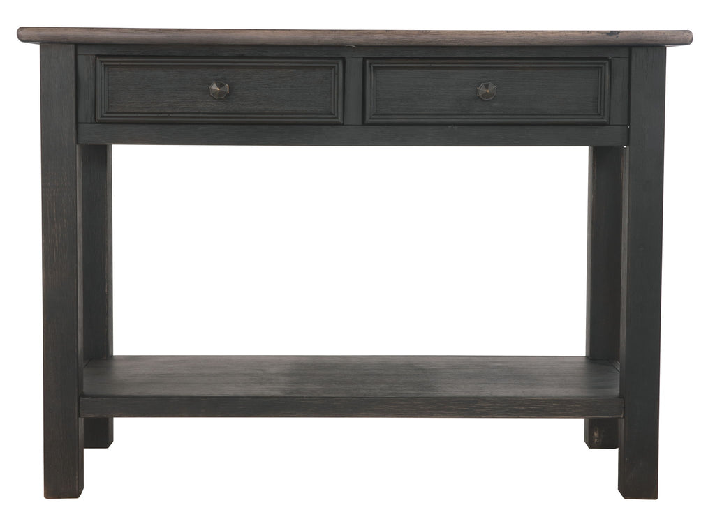 Shabby chic with a hint of down-home country, this sofa table is all the talk of today’s design world. Wood... Shabby chic with a hint of down-home country, this sofa table is all the talk of today’s design world. Wood grain shows through the weathered gray-brown top in all of its earthy pleasure. And the framed drawers, adorned with lovely traditional hardware, make it easy for you to store your belongings in style.Additional Dimensions Opening: 0" Drawer interior (2): 0" Product Features Made of solid and engineered wood and veneers Dark bronze-tone hardware 2 smooth-gliding drawers 1 bottom shelf Assembly required Tyler Creek - Sofa Table - Grayish Brown / Black46.13"W x 22.0"D x 33.25"H - 83.0 lb View more