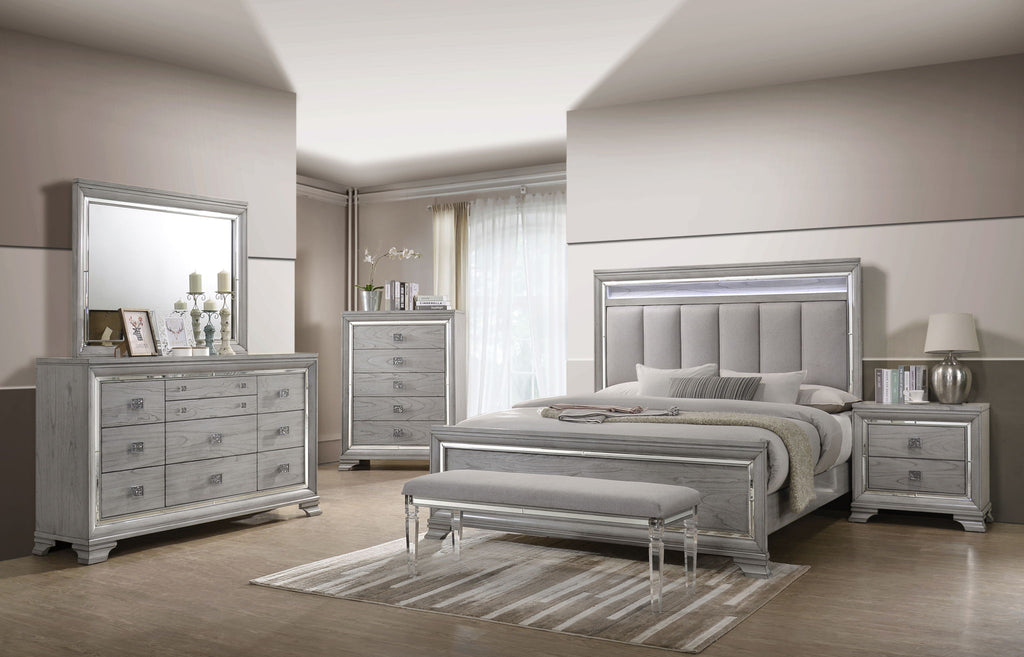 This elegant bedroom suite combines timeless design with contemporary appeal. The soft gray finish offers a modern twist on classic... This elegant bedroom suite combines timeless design with contemporary appeal. The soft gray finish offers a modern twist on classic styling, with integrated LED lighting on the tufted headboard adding a luxurious focal point. The collection includes a bed, nightstands, a dresser, and a mirror, all featuring refined detailing and silver-toned hardware that exudes sophistication. Each piece showcases a distinct wood grain pattern, enhancing the suite's upscale charm. The dresser and nightstand provide generous storage, with smooth-gliding drawers that cater to a seamless organization.Product Features Mirrored accents Unique square knobs Ball bearing drawer glides Dovetail drawer construction Vail - Chest - Gray38.0"W x 17.5"D x 53.7"H - 154.9 lb View more