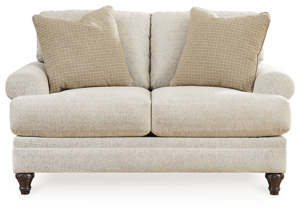 Seeking simple, transitional style? Enter this loveseat. Its commitment to carefree comfort is right at home with your relaxed living... Seeking simple, transitional style? Enter this loveseat. Its commitment to carefree comfort is right at home with your relaxed living room aesthetic. A subtle chevron effect elevates the everyday charm of the neutral fabric, while the deep, plush seats bring a cozy vibe to this chic piece.Additional Dimensions Arm height: 26" Distance between arms: 46" Seat depth: 27" Seat height: 22" Top of cushion to top of back: 17" Leg height: 5" Minimum width of doorway for delivery: 32" 24" Toss Pillow: 0" Product Features Corner-blocked frame Reversible seat and back cushions High-resiliency foam cushions wrapped in poly fiber Accent pillows included Pillows with feather-fiber blend Polyester upholstery Decorative turn leg Platform foundation system resists sagging 3x better than spring system after 20,000 testing cycles by providing more even support Smooth platform foundation maintains tight, wrinkle-free look without dips or sags that can occur over time with sinuous spring foundations Valerani - Loveseat - Sandstone65.0"W x 44.0"D x 40.0"H - 128.0 lb View more