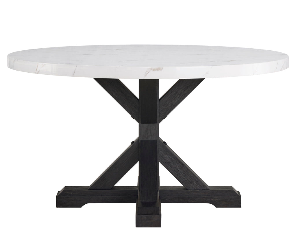 A fresh take on a traditional silhouette makes this group a great addition to your dining space. A faux marble... A fresh take on a traditional silhouette makes this group a great addition to your dining space. A faux marble top provides an elegant look while being easy to care for. Farmhouse style cross legs are updated in a contemporary charcoal finish. The upholstered dining chairs feature gently sloped wings and a nail head trim on the back. Button tufting accents the dining bench.Vance - 54" Faux Marble Dining Table Top - White Dimensions 54"L x 54"D x 30"H Weight 87.50 lbs Vance - Faux Marble Dining Table Leg - Charcoal Dimensions 54"L x 54"D x 30"H Weight 47.40 lbs Varley - Side Chair (Set of 2) - Gray Dimensions 26"L x 19.5"D x 40.5"H Weight 38.50 lbs Product Features Faux marble top X pedestal base Parson chair style Nail head trim Easy assembly View more