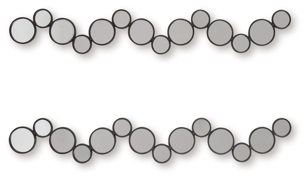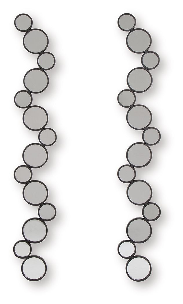 Time to refresh your walls? This accent mirror set is ready to introduce some modern whimsy. A playful arrangement of... Time to refresh your walls? This accent mirror set is ready to introduce some modern whimsy. A playful arrangement of circular mirrors creates a unique and eye-catching design, while the black frames add a sleek, sophisticated touch. You can hang them four ways—yes, four—to create a custom look that complements your fabulous style.Additional DimensionsInner mirror: 0"Product Features Set of 2 Made with metal Black frames I-ring bracket for hanging Hangs 4 ways Vinler - Accent Mirror Set (Set of 2) - Black7.75"W x 0.75"D x 50.0"H - 13.0 lb View more