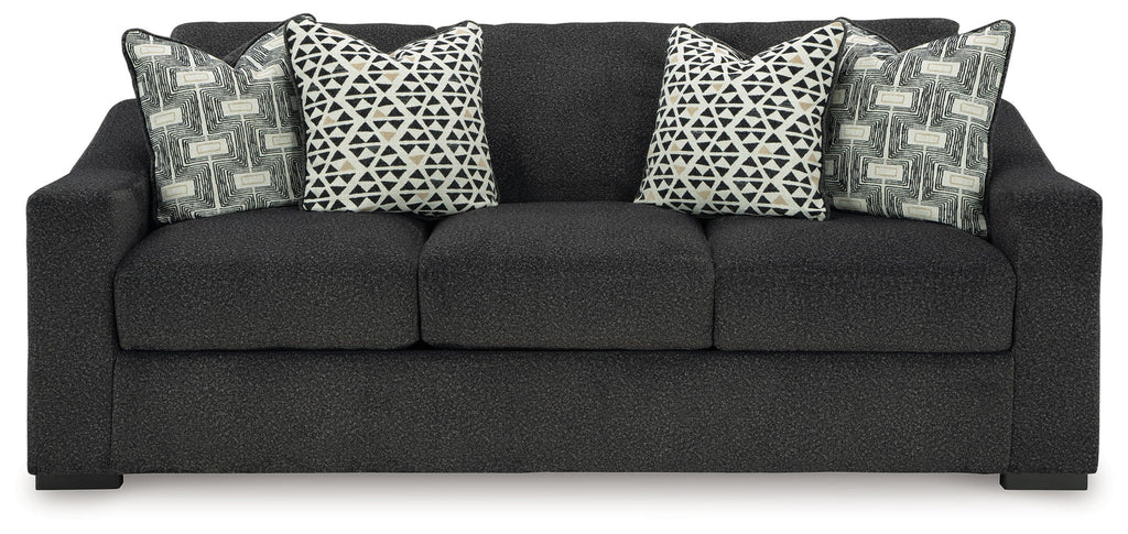 Your downtime should be super-cozy—and super-chic. This sofa encourages stylish indulgence as you lounge solo or with guests. Plush, chunky... Your downtime should be super-cozy—and super-chic. This sofa encourages stylish indulgence as you lounge solo or with guests. Plush, chunky upholstery adds a relaxed yet eclectic twist to the transitional look. With this exquisitely comfortable and fashion-forward piece, you can unwind in style.Additional Dimensions Arm height: 27" Distance between arms: 78" Seat depth: 25" Seat height: 23" Top of cushion to top of back: 16" Leg height: 1.5" Minimum width of doorway for delivery: 32" 24" Toss Pillow: 0" Product Features Corner-blocked frame Loose, reversible seat and loose back cushions High-density foam cushions wrapped in feather-fiber blend jacket Accent pillows included Pillows with feather-fiber blend Polyester upholstery Exposed feet with faux wood finish Platform foundation system resists sagging 3x better than spring system after 20,000 testing cycles by providing more even support Smooth platform foundation maintains tight, wrinkle-free look without dips or sags that can occur over time with sinuous spring foundations Wryenlynn - Sofa - Onyx93.0"W x 40.0"D x 40.0"H - 197.0 lb View more