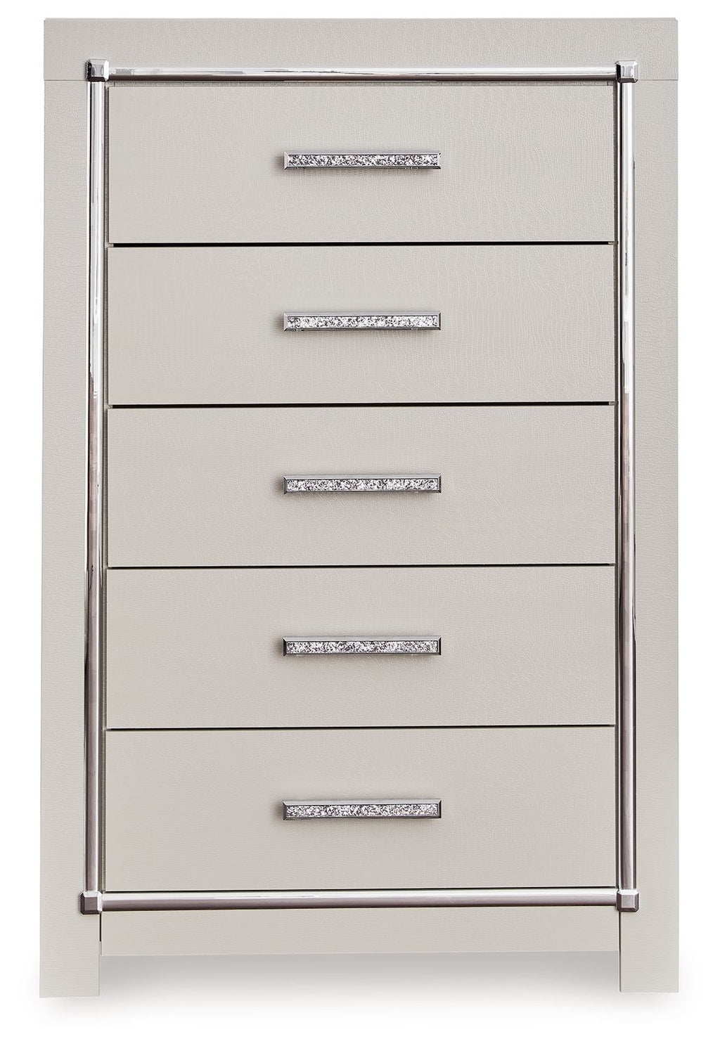 Bright, bold luxury. This chest of drawers dazzles with its attention to detail. Your love of glamorous style is reflected... Bright, bold luxury. This chest of drawers dazzles with its attention to detail. Your love of glamorous style is reflected in its all-over faux gator in a metallic finish, exquisitely paired with faceted chrome-tone details. Complete with smooth-gliding storage drawers, it inspires you to live luxuriously every day—whether dressing up to go out or dressing down to stay in.Additional DimensionsDrawer interior (5): 0"Product Features Made with engineered wood (MDF/particleboard/plywood) and decorative laminate for the right balance of affordability and durability Silvertone pearl finished faux gator Decorative laminate replicates natural or man-made material surfaces with consistent color, pattern and texture Handles with faux crystal accents 5 smooth-gliding drawers Drawer interiors are lined with a faux linen laminate for a clean, finished look Faceted chrome-tone details Safety is a top priority, clothing storage units are designed to meet the most current standard for stability, ASTM F 2057 (ASTM International) Drawers extend out to accommodate maximum access to drawer interior while maintaining safety Minor assembly required Zyniden - Five Drawer Chest - Silver33.7"W x 15.71"D x 51.02"H - 152.0 lb View more