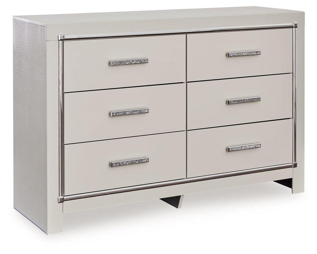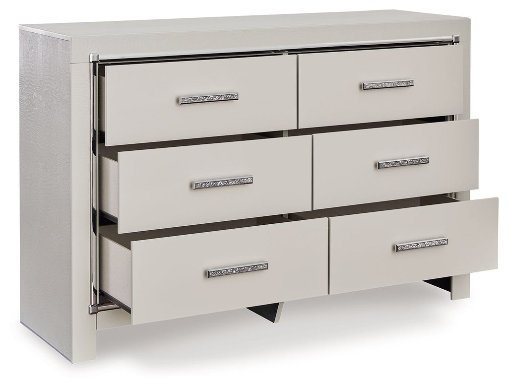 Bright, bold luxury. This dresser dazzles with its attention to detail. Your love of glamorous style is reflected in its... Bright, bold luxury. This dresser dazzles with its attention to detail. Your love of glamorous style is reflected in its all-over faux gator pattern in a metallic finish, exquisitely paired with faceted chrome-tone details. Complete with smooth-gliding storage drawers, it inspires you to live luxuriously every day—whether dressing up to go out or dressing down to stay in.Additional Dimensions Drawer interior (6): 0" Assembled dresser/mirror: 76" Product Features Made with engineered wood (MDF/particleboard/plywood) and decorative laminate for the right balance of affordability and durability Silvertone pearl finished faux gator Decorative laminate replicates natural or man-made material surfaces with consistent color, pattern and texture Handles with faux crystal accents 6 smooth-gliding drawers Drawer interiors are lined with a faux linen laminate for a clean, finished look Faceted chrome-tone details Safety is a top priority, clothing storage units are designed to meet the most current standard for stability, ASTM F 2057 (ASTM International) Drawers extend out to accommodate maximum access to drawer interior while maintaining safety Minor assembly required Zyniden - Six Drawer Dresser - Silver60.67"W x 15.28"D x 40.0"H - 178.0 lb View more